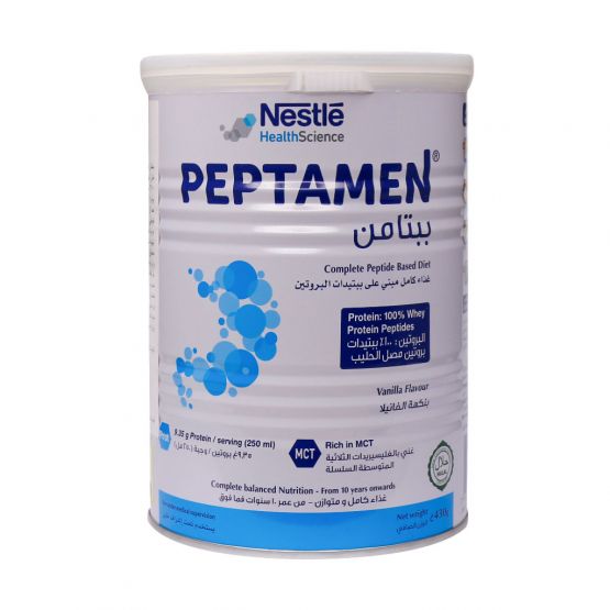 پودر پپتامن غذای ویژه رژیمی با طعم وانیل نستله ۴۰۰ گرم،غذایی کامل بر پایه پپتید است که جهت رفع نیازهای تغذیه ای (ریز مغذی و درشت مغذی) در کودکان (۱۰-۱ سال) که از سو هضم، سو جذب و یا سوتغذیه ناشی از بیماری های مزمن و حاد رنج می برند مورد استفاده قرار می گیرد.