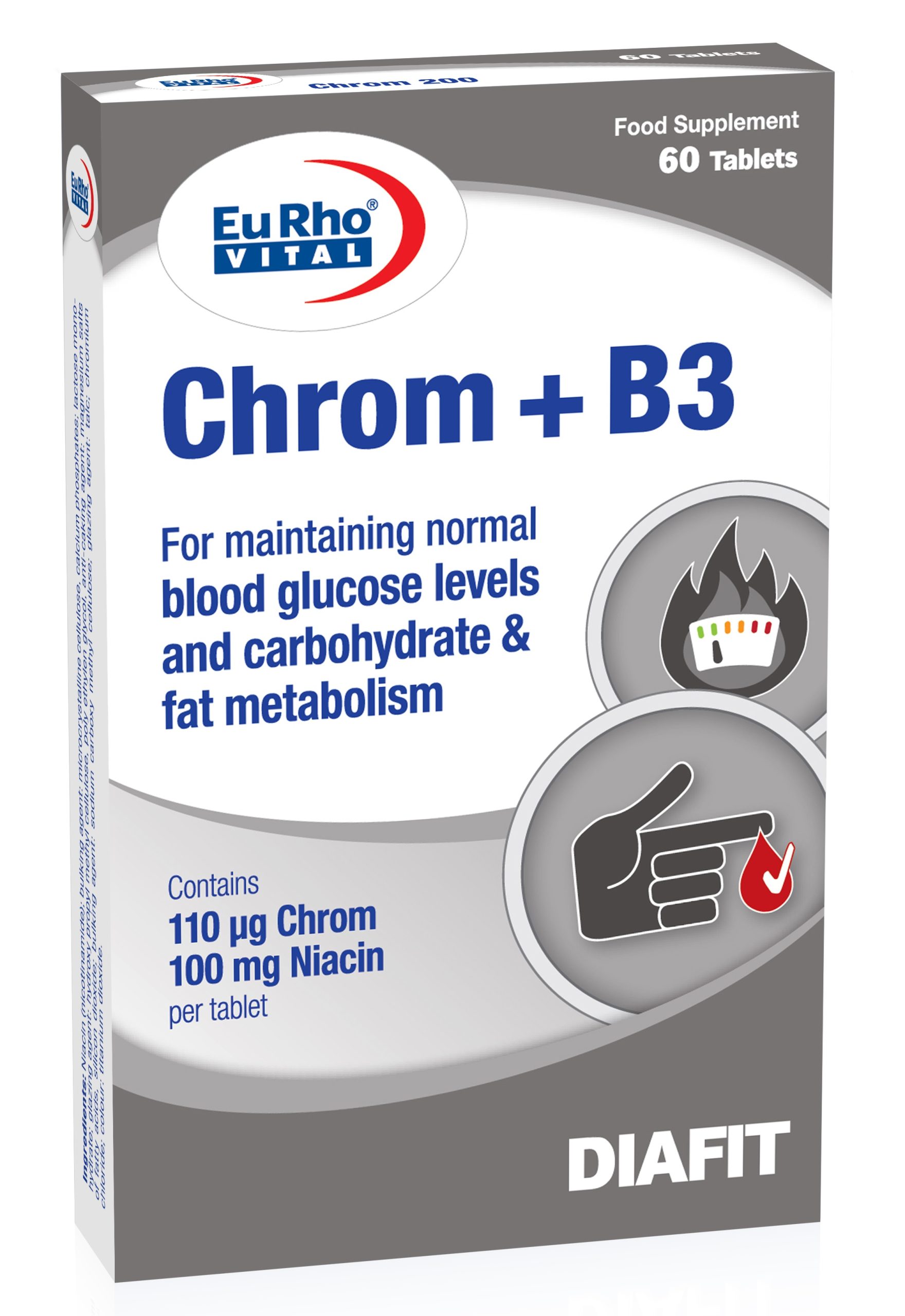 قرص کروم + B۳ یوروویتال، حاوی کروم و نیاسین است و جهت پیشگیری و درمان دیابت نوع ۲، اضافه وزن و چاقی، سندروم متابولیک، افزایش چربیهای خون و سندروم تخمدان پلیکیستیک (PCOS) موثر میباشد.
