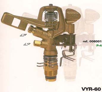 VYR ۶۰ آبپاش ویرسا مدل ۶۰ برنجی: شعاع پاشش این آبپاش به طور معمول بین ۱۳ الی ۱۸ متر می باشد. دبی خروجی از نازل های آن بین ۹۲۰ تا ۳۲۷۰ لیتر بر ساعت می باشد. از ویژگی های این آبپاش می توان به تنظیمی بودن آن و سایز ورودی ۳/۴ اینچ آن اشاره کرد.