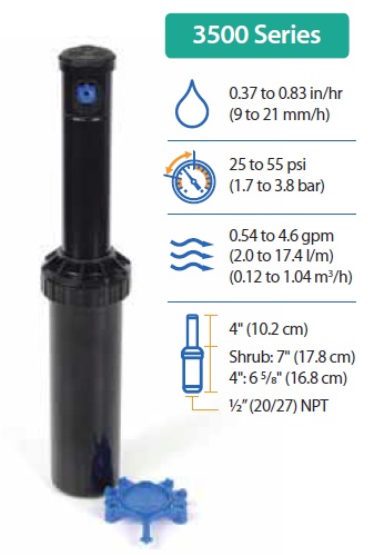 روتورهای سری ۳۵۰۰، با هدف استفاده در نواحی کوچک تا متوسط فضای سبز تولید شده اند. این آبپاش ها دارای ویژگی های تنوع نازل ها و تنظیم راحت هستند که مناسب برای فضای موجود در مناطق شهری شده اند.
