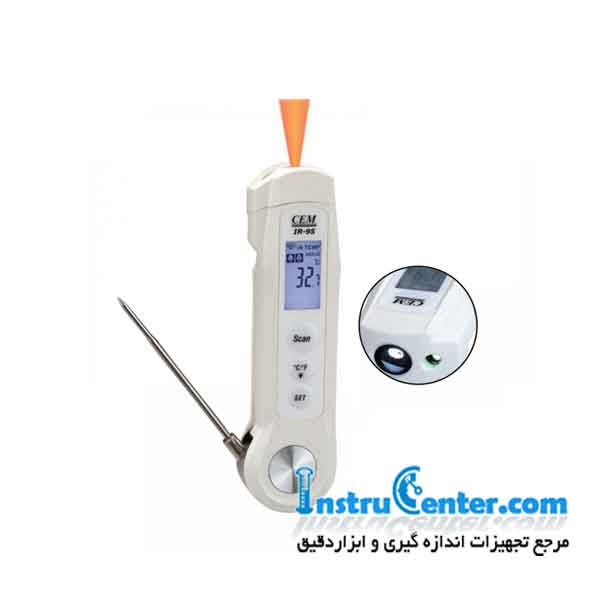 دماسنج نفوذی و لیزری IR-۹۵ CEM IR-۹۵ این دستگاه یک دماسنج مادون قرمز مجهز به پروب اندازه گیری (سنسور) است. این امکان را به شما می دهد تا دمای سطح و دمای داخلی جسم را اندازه گیری کنید. این دستگاه به دور روش لیزری و نفوذی دما را اندازه گیری می کند. محدوده دمایی دستگاه با روش مادون قرمز از -۴۰ºC تا ۲۸۰ºC (-۴۰ºF تا ۵۳۶ºF) و با پراب از : -۴۰ºC تا ۲۳۰ºC (-۴۰ºF تا ۴۴۶ºF) می باشد. یک تایمر شمارش معکوس یکپارچه با خطوط مانیتورهای زنگ هشدار در دستگاه تعبیه شده که به کاربر این امکان را می دهد تا زماغن پخت و دما ره به طور همزمان چک کند.
