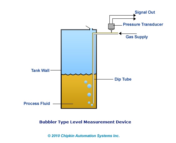 در این روش برای شناسایی ارتفاع سیال، از جریان کم و ثابت یک گاز خنثی در انتهای مخزن استفاده می شود. در واقع حداقل فشار گاز باید کمی بیشتر از فشار انتهای مخزن باشد تا گاز بتواند خارج شود. هر چه ارتفاع مخزن بیشتر باشد فشار بیشتری در انتهای مخزن وجود دارد و در نتیجه فشار بیشتری نیاز است تا جریان گاز بتواند ادامه پیدا کند و با کم شدن ارتفاع سیال، گاز برای خروج از انتهای مخزن نیاز به فشار کمتری دارد. بنابراین با اندازه گیری فشار گاز مورد نیاز برای ایجاد جریان ثابت گاز در انتهای مخزن، می توان ارتفاع مخزن را محاسبه نمود.