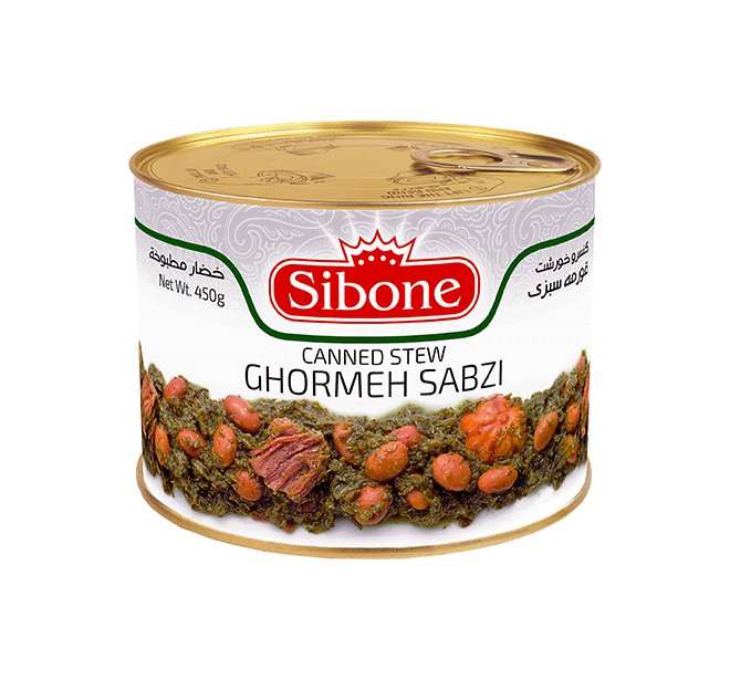 محتویات: سبزی قورمه، لوبیا چیتی، گوشت قرمز تکه‌ای (۱۴%)، روغن نباتی مایع (سویا)، لیمو عمانی، پیاز، نمک، رب گوجه فرنگی، ادویه، آب، نشاسته گندم.