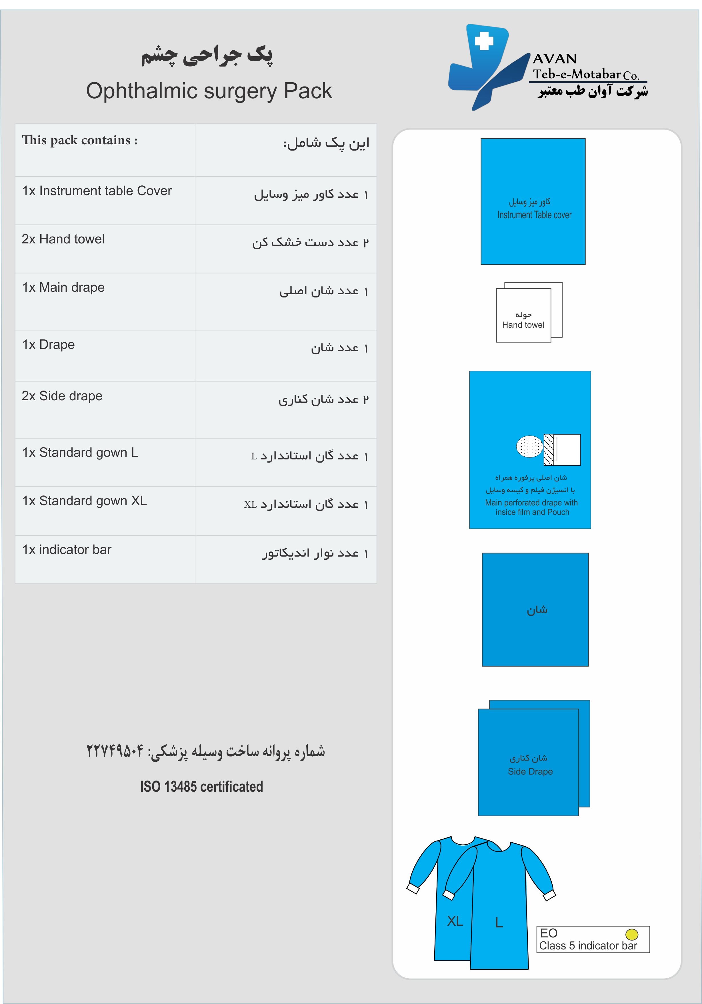 این پک شامل: شان پرفوره چسب دار همراه با كيسه وسايل - کاور میز-۲ عدد شان کناری-۲ عدد دست خشک کن (دستمال جاذب)- گان استاندارد سایز L- گان استاندارد سایز XL و نوار چسب می باشد. محتویات این پک بر اساس سفارش مشتری قابل تغییر می باشد.