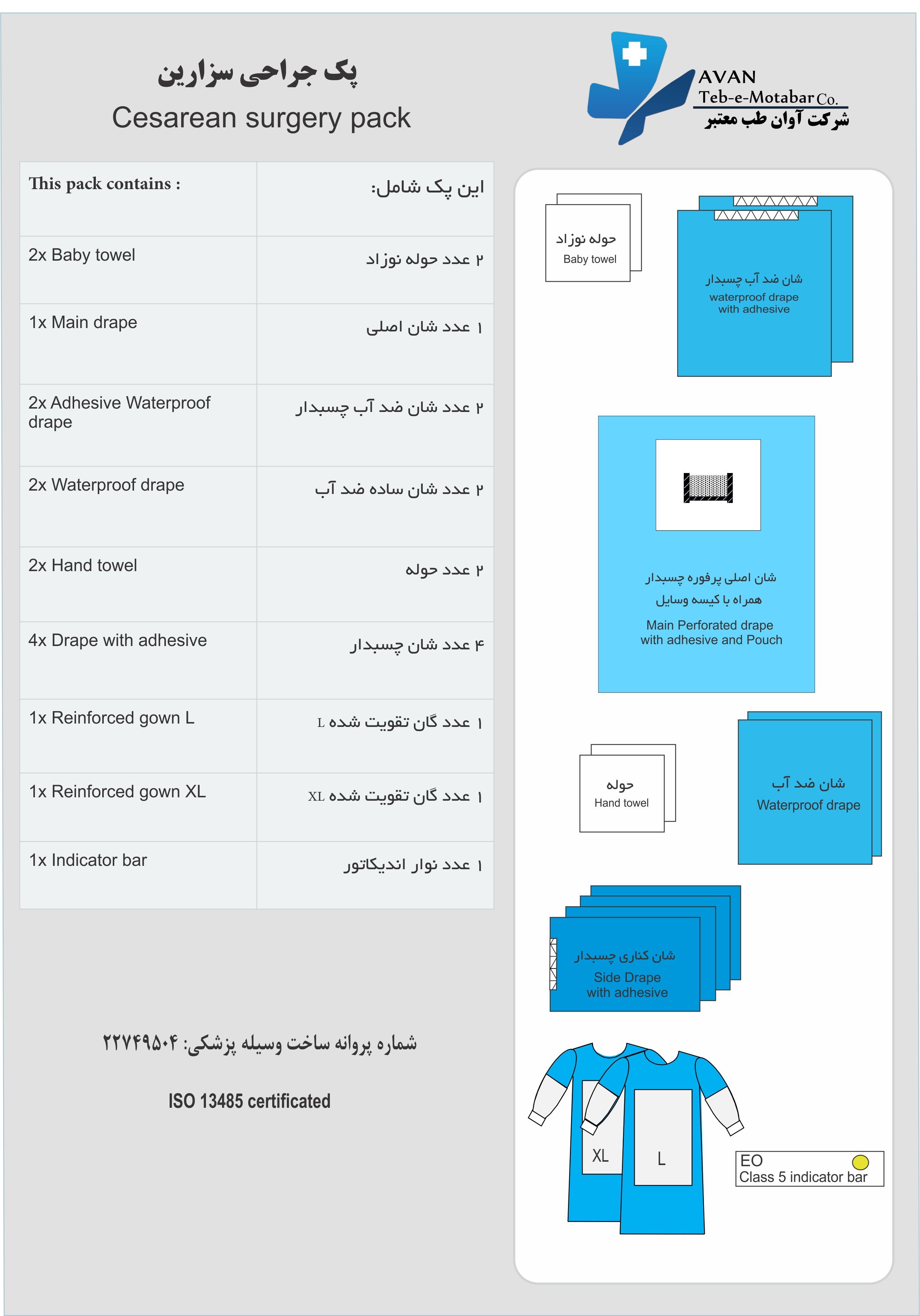 این پک شامل: ۱ عدد کاور میز مایو، ۲ عدد جوراب لیتوتومی ۲ عدد شان، ۲ عدد دست خشک کن، گان استاندارد L، می باشد. محتویات این پک بر اساس سفارش مشتری قابل تغییر است.