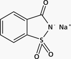 ساخارین سدیم، پودر سفید رنگ بی بو، بی رنگ با طعم شیرین است. به دلیل نقص های گوناگون سلامت و بهداشت، سازمان جهانی بهداشت مصرف روزانه خود را محدود به کمتر از ۰.۵ میلی گرم به ازای هر کیلوگرم کرده است.