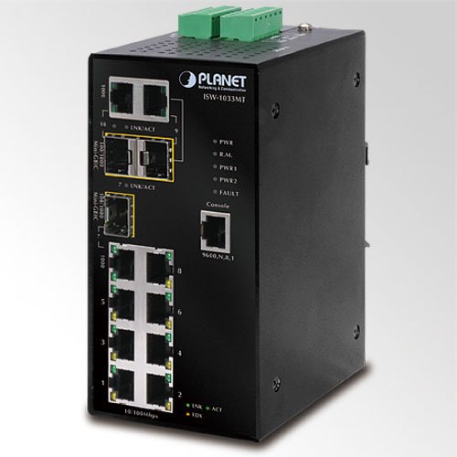 The PLANET ISW-۱۰۳۳MT Managed Industrial Ethernet Switch is equipped with multiple redundant ring technology and provides ۷ ۱۰/۱۰۰Mbps Fast Ethernet, ۳ Gigabit TP/SFP combo interfaces and ۲ DI/DO delivered in a rugged strong case. It is an industrially (substation) hardened and fully managed with Ethernet Switch specifically designed to operate reliably in electrically harsh, climatically demanding, wide temperature range (-۴۰? to ۷۵?) and centralized power management environments.