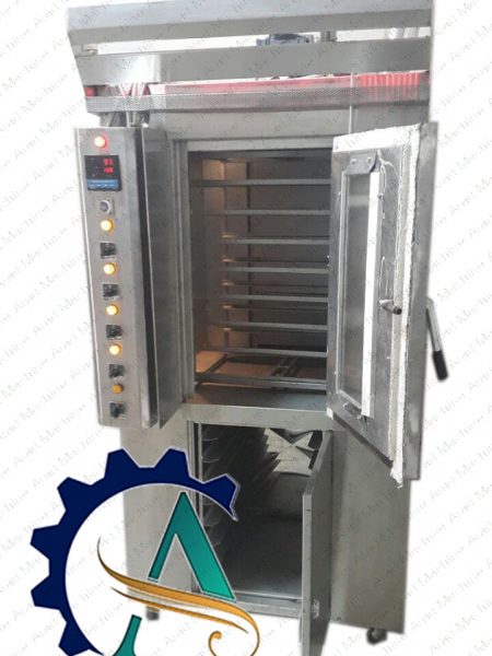 دستگاه فر صنعتی گردان ۸ دیس با ابعاد ۱۹۰* ۱۰۰* ۱۴۵ سانتی متر و با ظرفیت ۸ دیس گردان ۴۰*۶۰ سانت ساخته می شود.