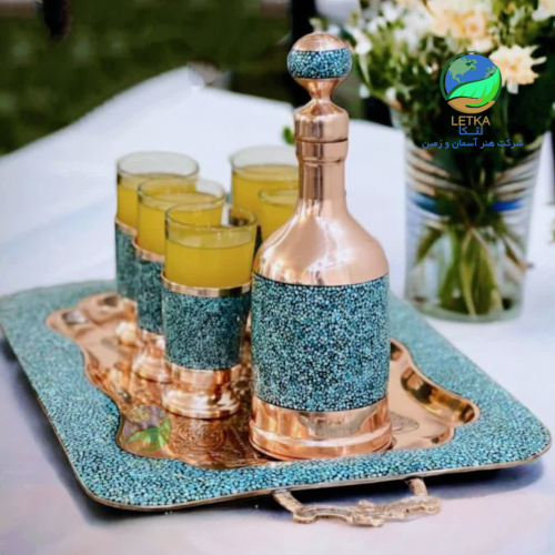 Copper and turquoise narrow set and cup holder A narrow drinking glass can be used everyday to consume liquids with a height of 30 cm along with 6 cup holders with a height of 10 cm.