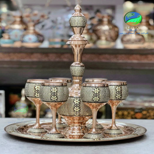 A tight set, a cup and a tray of copper Khatam Kob A 43 cm tall cherry jar with 6 16 cm cups and a 35 cm round tray.