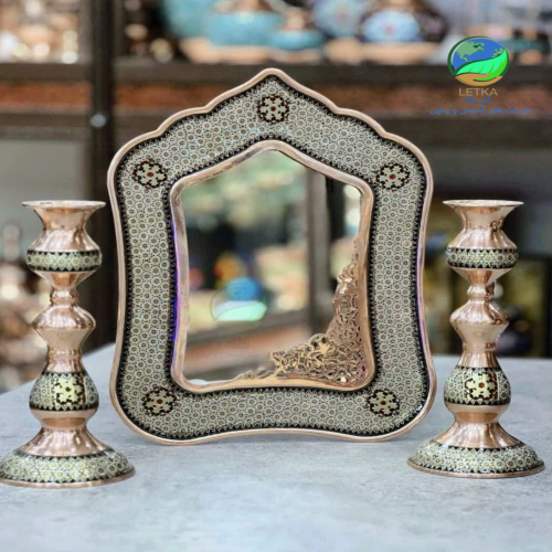 Set of 30 mirrors and 20 candlesticks made of copper and Khatam A 30 cm high rectangular mirror made of Khatam Kob copper and two 20 cm high candlesticks