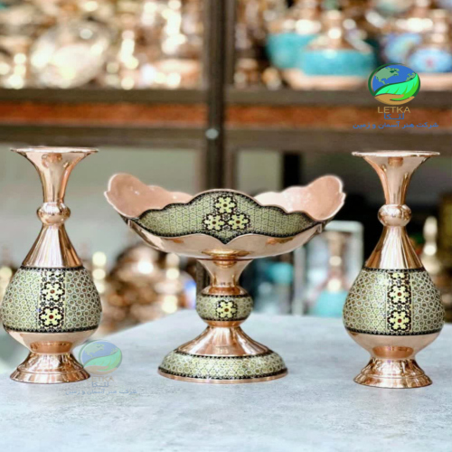 A set of three-sided fruit bowls and copper vases and inlays A 24 cm high fruit bowl made of Khatam Kob copper, along with two 25 cm high vases